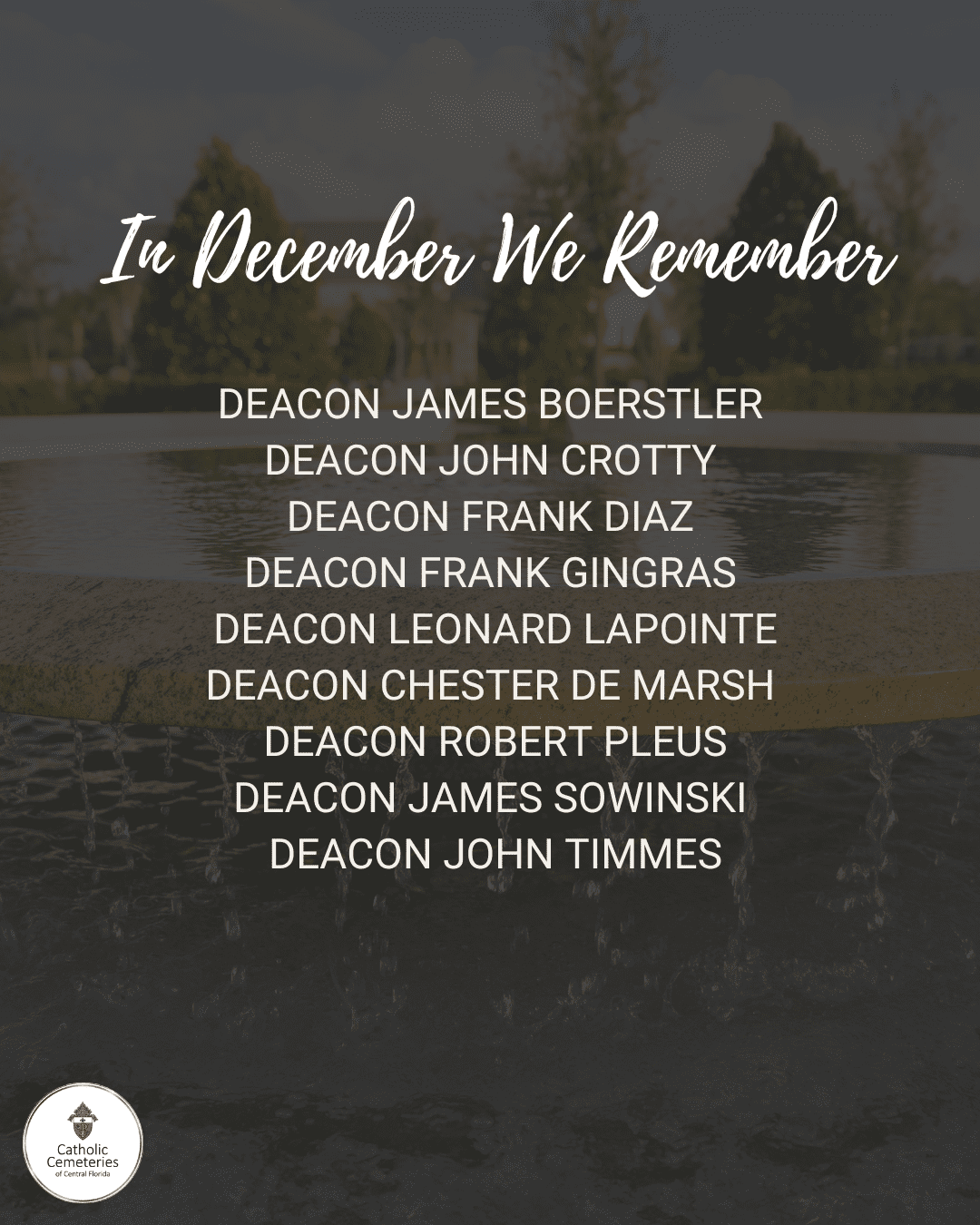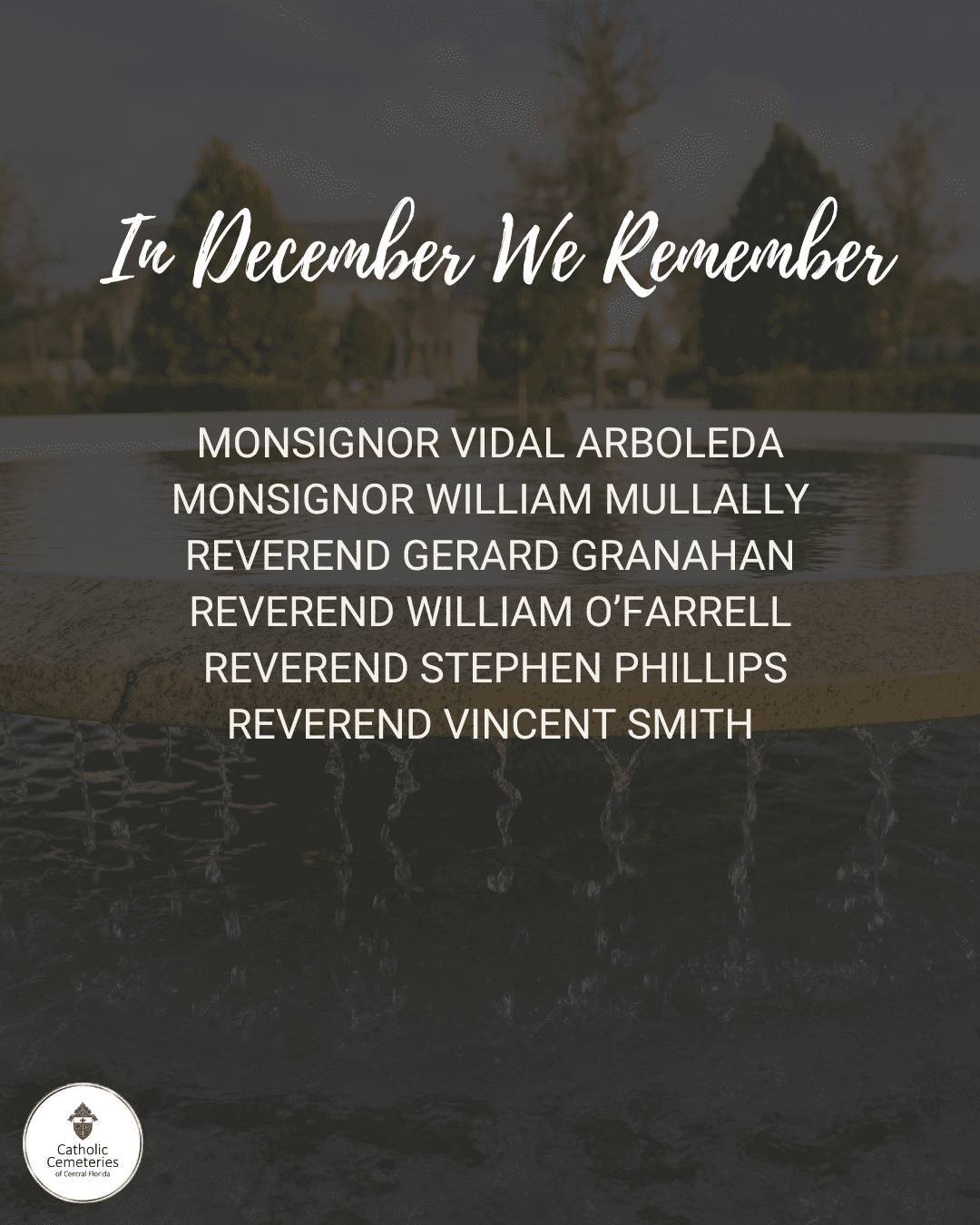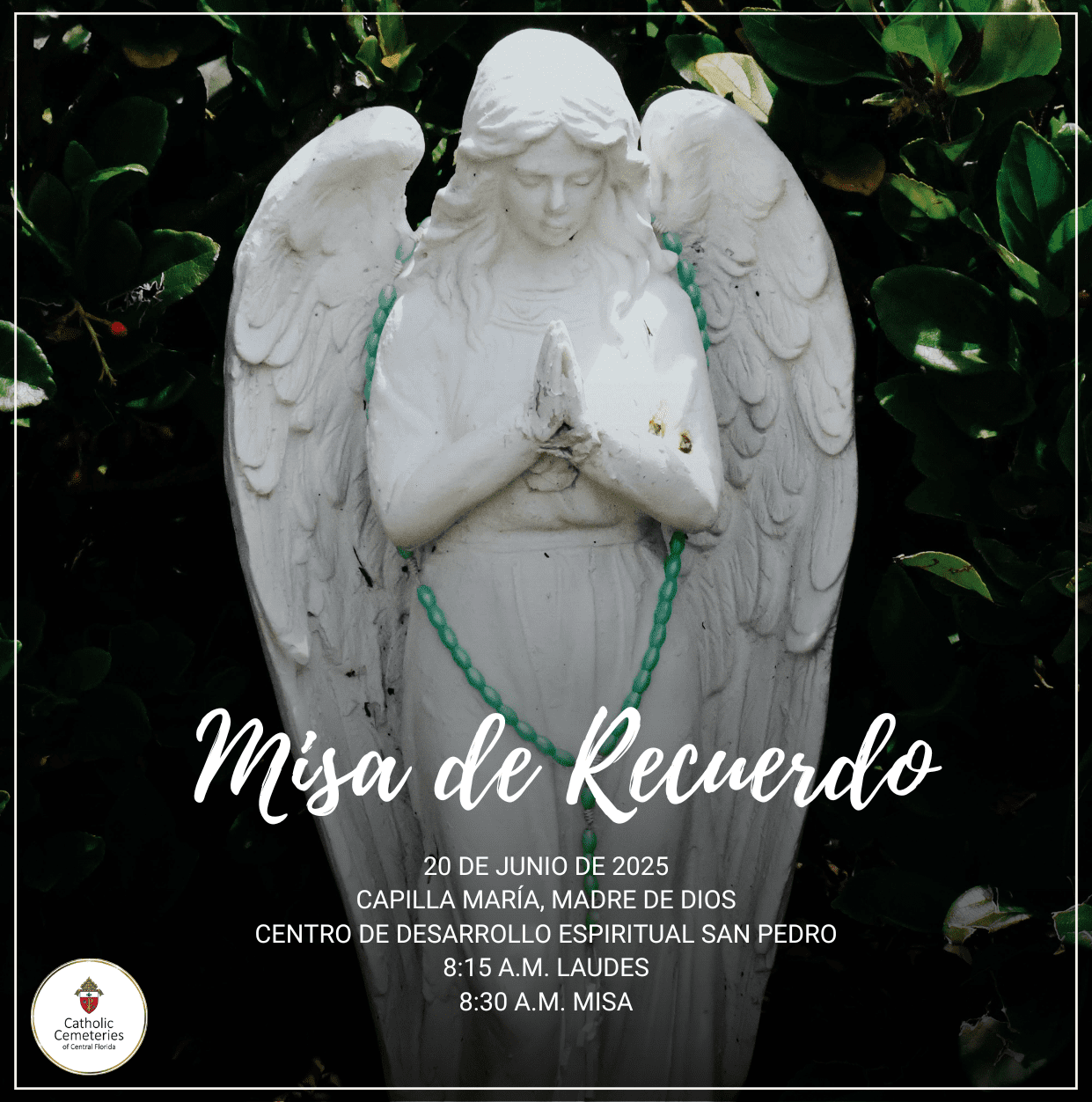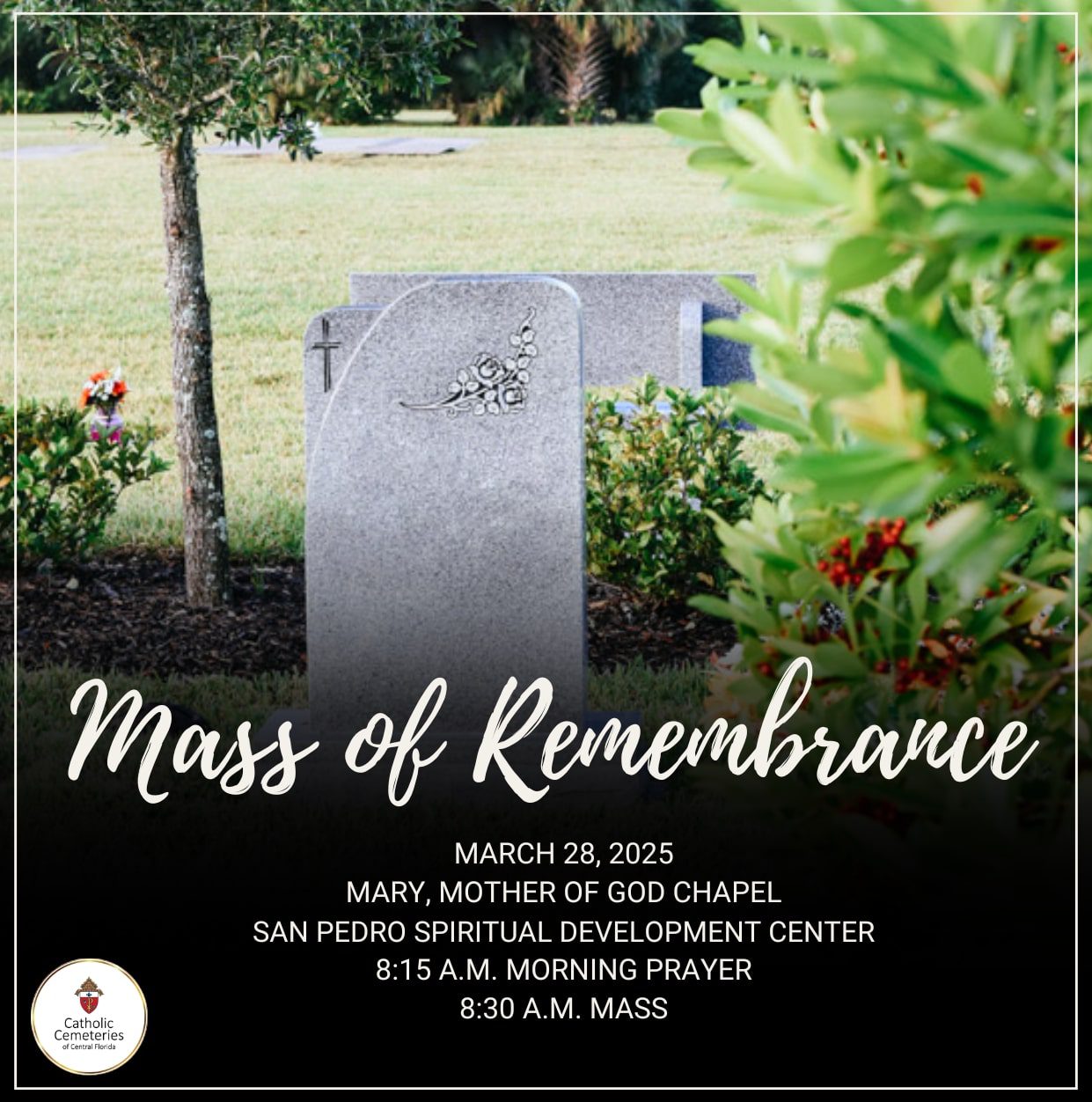 Join Queen of Angels Cemetery staff each month for a Memorial Mass at Mary, Mother of God Chapel, San Pedro Spiritual Development Center, 95 Bishop Grady Ln., Winter Park. Mass includes special intercession for deceased priests, deacons, and all those buried in Queen of Angels Cemetery. Liturgy of the Hours is at 8:15 a.m.; 8:30 a.m. Mass. Please pray for clergy who died in this month and for all those buried in Queen of Angels Cemetery.
