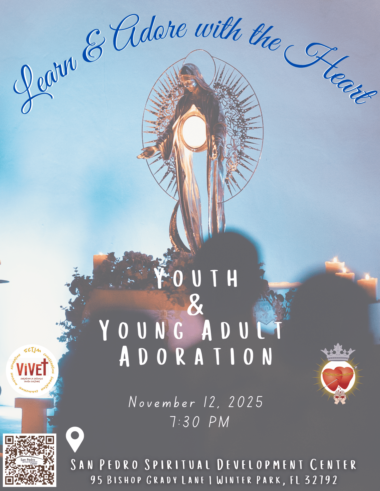 All youth and young adults are invited to join the Servants of the Pierced Heart of Jesus and Mary for Formation, Adoration, Praise and Worship and Prayer on Wednesday, November 12, from 7:30 p.m. to 8:30 p.m. in the Mary, Mother of God Chapel. No registration required.