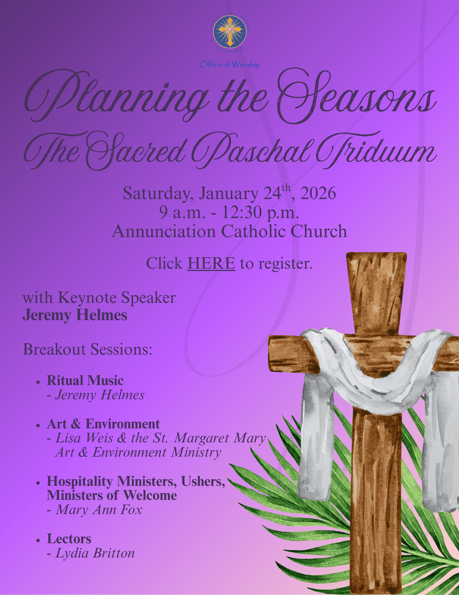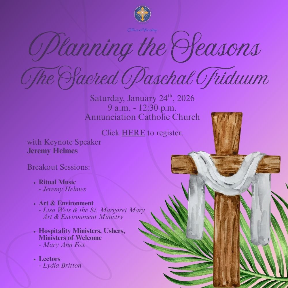 The Office of Liturgy and Worship at the Diocese of Orlando invites you to Planning the Seasons: The Sacred Paschal Triduum on January 24 from 9 a.m. to 12:30 p.m. at Annunciation Catholic Church (1020 Montgomery Road, Altamonte Springs, FL 32714).
