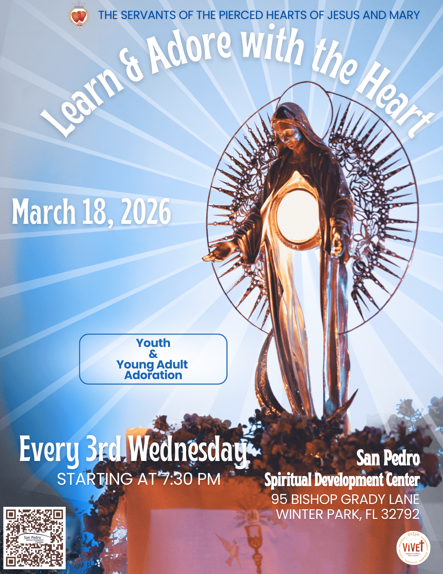 All youth and young adults are invited to join the Servants of the Pierced Heart of Jesus and Mary for Formation, Adoration, Praise and Worship and Prayer on Wednesday, March 18, from 7:30 p.m. to 8:30 p.m. in the Mary, Mother of God Chapel. No registration required.