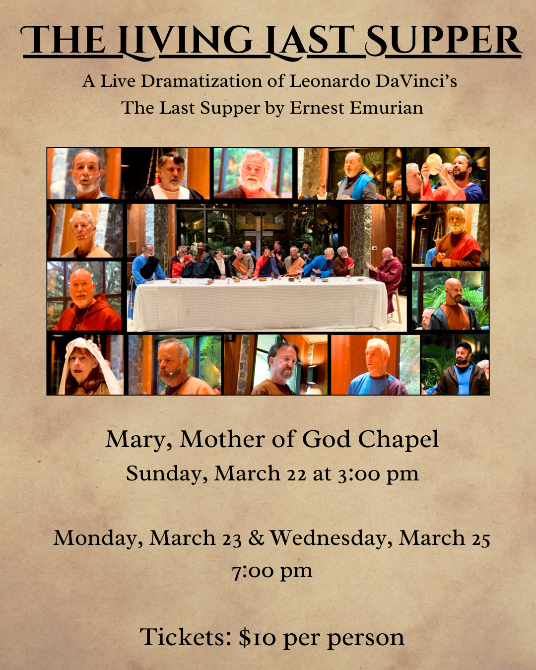 In March 2026, San Pedro Center will present multiple performances of the living dramatization of Ernest Emurian’s “The Last Supper,” adapted by Marty and Vicki Wicks, directed by Caryl DeGrandi and produced by Pat Hanavan in the Mary, Mother of God Chapel. . This moving production captures the moment when Jesus says, “One of you will betray me” prompting the famous pose from Leonardo DaVinci’s painting. One by one, each apostle steps out of the painting to share their story, their relationship to Jesus, and one another.