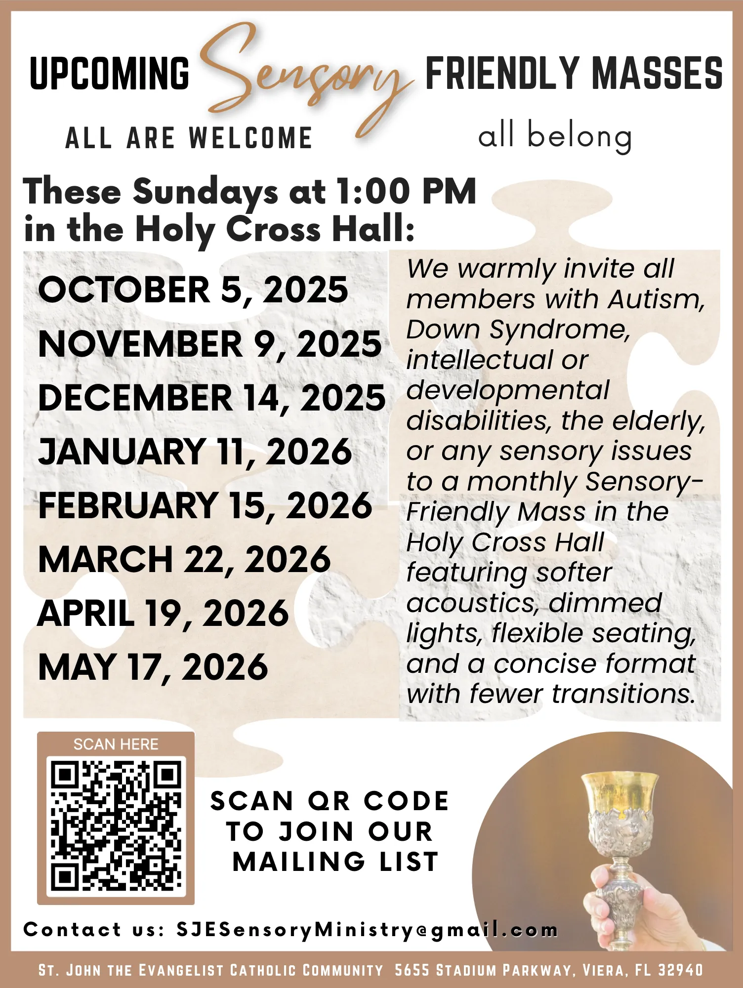 St. John the Evangelist, 5655 Stadium Pkwy, Melbourne, FL 32940, warmly invites all with Autism, Down Syndrome, intellectual or developmental disabilities, the elderly, or any sensory issues to a monthly Sensory-Friendly Mass in Holy Cross Hall featuring softer acoustics, dimmed lights, flexible seating, and a concise format with fewer transitions. The Masses are held at 1:00 p.m. Contact SJESensoryMinistry@gmail.com with any questions.