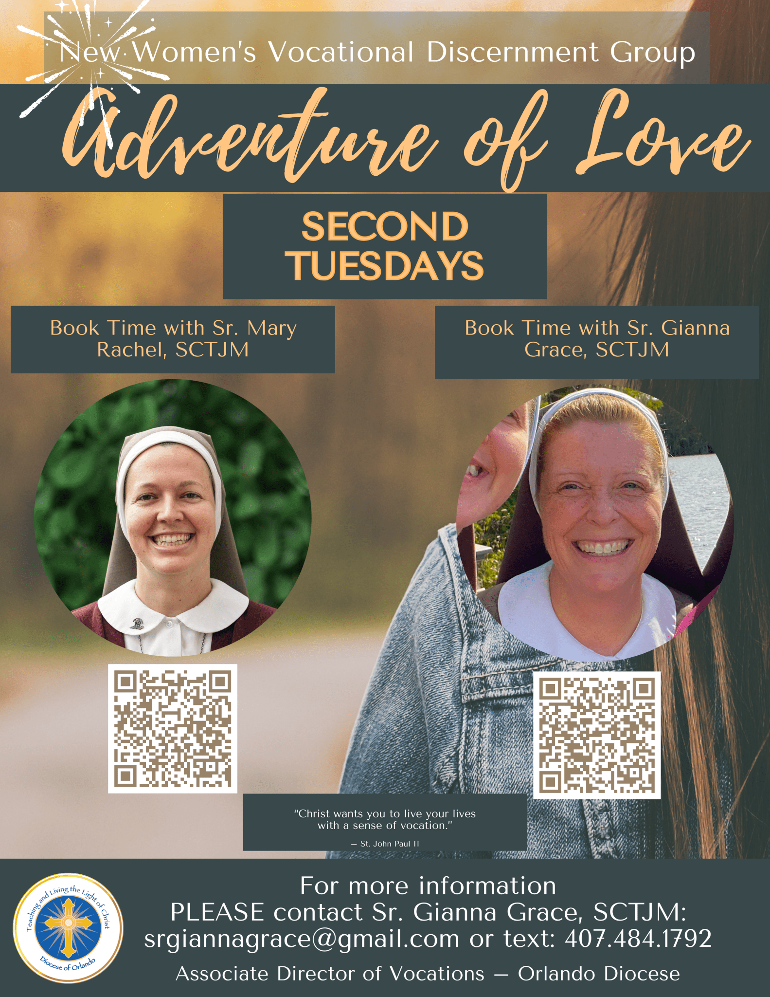 You are invited to join Adventure of Love, a new Women’s Vocational Discernment Group, on the second and fourth Tuesdays of each month from 6:00 p.m. to 7:30 p.m. at the Catholic Campus Ministry Building at UCF (Northview Building, 3925 Lockwood Blvd #1051 Oviedo, FL 32765). Every second Tuesday there will be personal meetings, with group meetings happening every fourth Tuesday of the month. Join us for dinner, discernment, discussions, and deep questions.