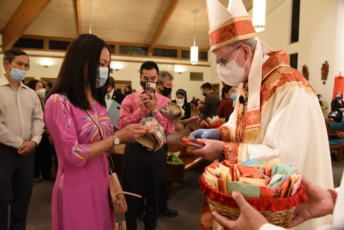 The bishop spoke of Pope Francis’ comments during the most severe time of pandemic in Italy last year. The Pope recalled Mark’s Gospel of the Calming of the Storm when the disciples, in the middle of the storm at sea said to Jesus, “Don’t you care.” And Jesus responded, “Don’t you have faith?” Bishop Noonan acknowledged we all have moments of fear. The bishop said Isaiah told the Israelites the same when they were prisoners in Babylon, in exile. Just like Isaiah, Bishop Noonan asked the Vietnamese community gathered “to focus on and pray for the future, that life will be better.” Recalling how many Vietnamese had to leave their homeland and families behind, he turned to Scripture and reminded parishioners, “Isaiah tells the people of Israel that God is good. Turn to God in faith. Peace, hope, and calm will come.”