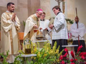 At the Mass, the priests of the diocese renewed their priestly vows and promises, and Bishop Noonan blessed the sacred Chrism, Oil of Catechumens, and Oil of the Sick. Priests celebrating the 25th, 50th and 60th anniversaries of their priestly ordination were also recognized and honored.