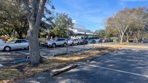 A long line of cars wait in line for groceries during Catholic Charities of Central Florida’s Mobile Food Distribution at Our Lady of Hope in Port Orange Feb. 27, 2026. (COURTESY)