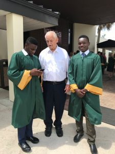 Ugandan students Simon, left, and Bernard at their graduation from Trinity Catholic, with Deacon Jim Schwartz. Bernard is studying to become a lawyer. The late Deacon Schwartz sponsored several students of the Ugandan mission through college. An estimated 1,000 sponsored from Blessed Trinity and as far as Ireland are sponsoring 160 students in Uganda through college. (COURTESY)