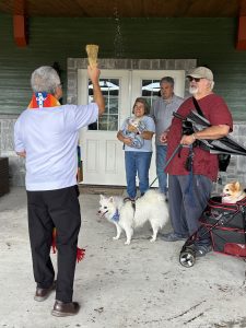 The crowd braved rain showers and huddled under the portico as Father Eco prayed from the Book of Blessing, “God’s creation inhabit the skies, the earth, and the sea. They share in the fortunes of human existence and have a part in human life. God, who confers his gifts on all living things, has often used the service of animals or made them symbolic reminders of the gifts of salvation. Animals were saved from the flood and afterwards made a part of the covenant with Noah (Gen 9:9-10). The paschal lamb brings to mind the Passover sacrifice and the deliverance from the bondage of Egypt (Exodus 12:3-14); a giant fish saved Jonah (Jonah 2:1-11); ravens brought bread to Elijah (1 Kings 17:6); animals were included in the repentance enjoined on humans (Jonah 3:7).”
