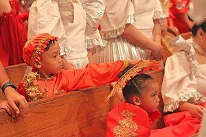 A boy in traditional Filipino garb holding a statue of Santo Niño feels the headress of a young girl sitting in the pew in front of him during the 20th annual diocesan celebration of the feast day of Señor Santo Niño at the Basilica of the National Shrine of Mary, Queen of the Universe Jan. 25, 2026.