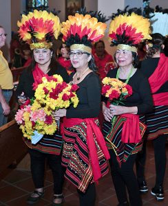 The crisp beats reverberated against the walls and got the whole congregation moving — those in the pews and those awaiting to process. Members of the Filipino community from across Central Florida, Tallahassee and Tampa held banners and statues of Santo Niño. Some women wore elaborate gowns, others wore feathery headdresses, and every one of them swayed to the beat and held up their statues down the aisle as congregants clapped and held up their own statues.